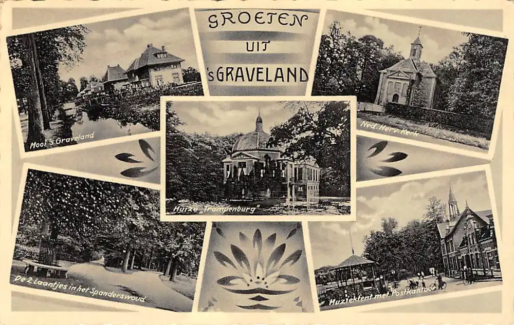 ‘s-Graveland Groeten uit 1935 De 2 Laantjes in het Spaanderswoud Huize Trompenburg Ned. Herv. Kerk Muziektent met Postkantoor Hilversum HC25207 Ostatnia szansa
