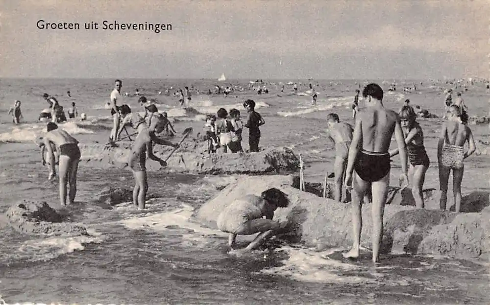 Scheveningen Groeten uit met badgasten en spelende kinderen op strand en in zee HC6465 Tani