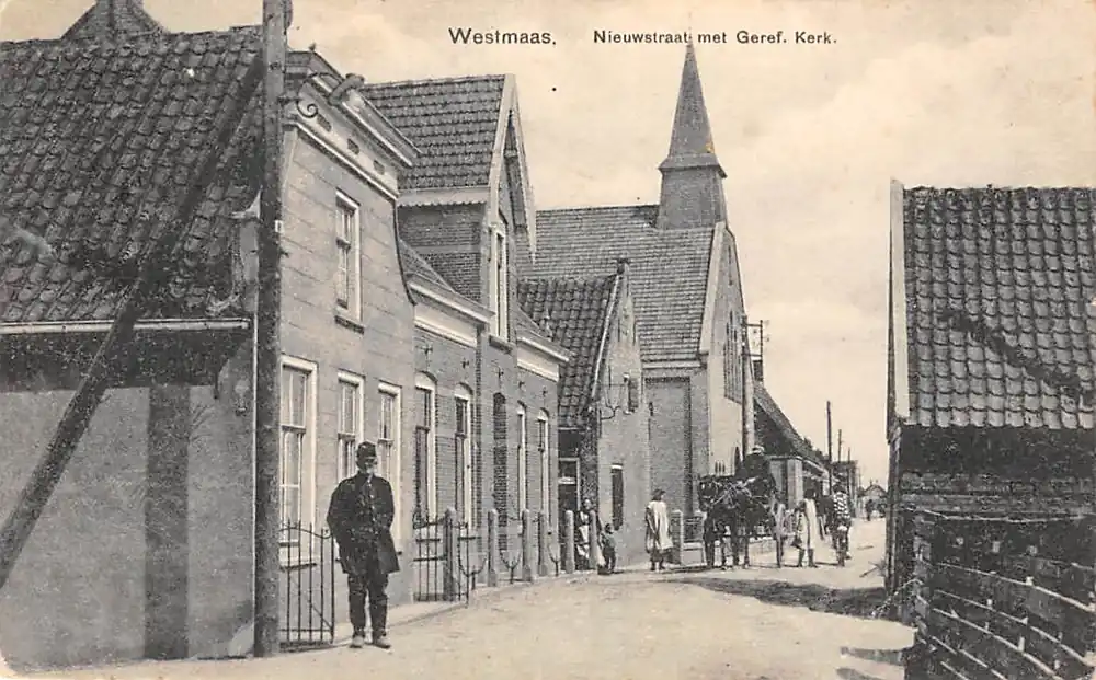 Uitg. R. Groeneveld, Westmaas. Gelopen ansichtkaart met stempel; postzegel verwijderd. Hoekjes onder miniem gesleten.