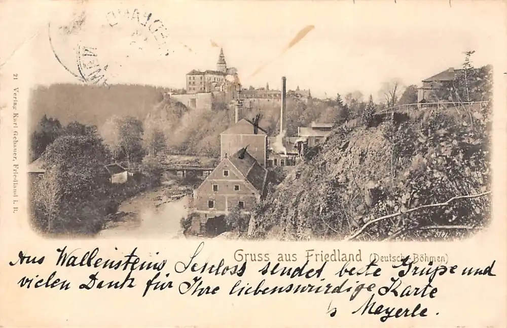 21. Verlag Karl Gebaner, Friedland i. B. Gelopen ansichtkaart met stempels 1901. Postzegel verwijderd. Knikje bovenhoekje links.