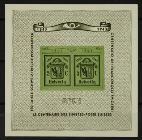Zwitserland 1943, Michel Blok 10, Postzegeltentoonstelling Genève, 100e verjaardag “Doppelgenf”, postfris / MNH