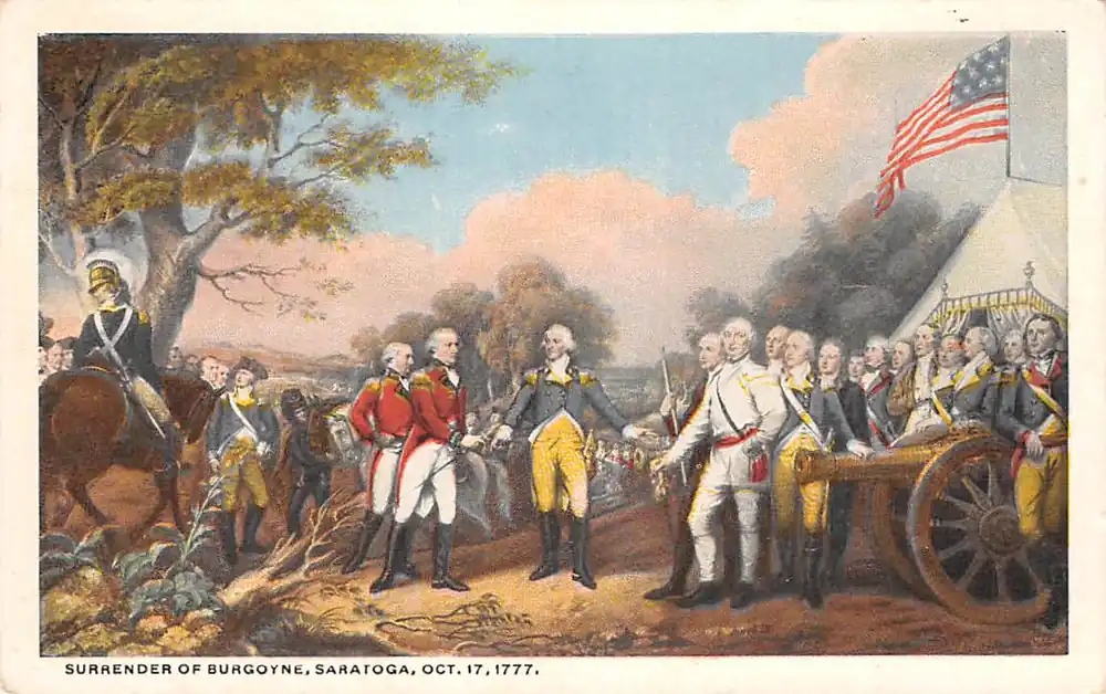 Published by B.S. Reynolds Co. 1202 D. St. Northwest, Washington D.C. Ongelopen ansichtkaart.\\r\\n\\r\\nDe overgave van generaal Burgoyne\\u00a0is een\\u00a0olieverfschilderij\\u00a0van de Amerikaanse kunstenaar\\u00a0John Trumbull. Het schilderij werd voltooid in 1821 en hangt in de\\u00a0rotonde van het Capitool van de Verenigde Staten\\u00a0in\\u00a0Washington, D.C.\\r\\n\\r\\nHet schilderij toont de overgave van de\\u00a0Britse\\u00a0luitenant-generaal\\u00a0John Burgoyne\\u00a0in\\u00a0Saratoga, New York\\u00a0op 17 oktober 1777, tien dagen na de\\u00a0Tweede Slag bij Saratoga. Inbegrepen in de afbeelding zijn veel leiders van het Amerikaanse\\u00a0Continentale Leger\\u00a0en\\u00a0milities\\u00a0die deelnamen aan de strijd, evenals de\\u00a0Hessische commandant\\u00a0Friedrich Adolf Riedesel\\u00a0en twee Britse\\u00a0legerofficieren: Burgoyne en generaal\\u00a0William Phillips.
