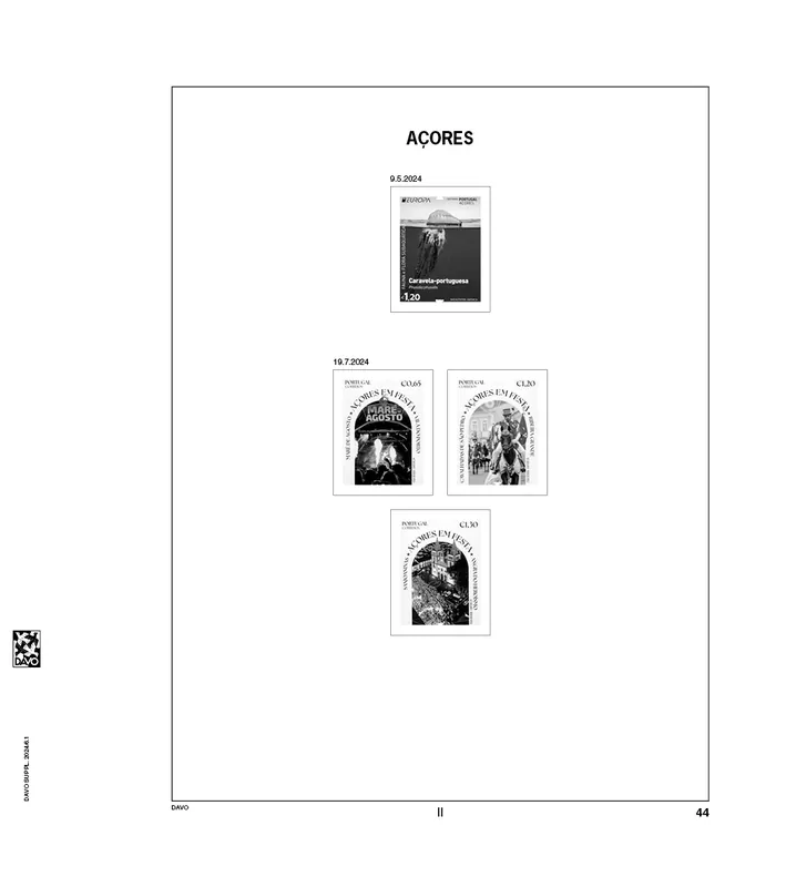 Davo Luxe supplement Azoren / Madeira 2024Bevat 6 luxe bladen (170 grs. stevig papier) met heldere klemstroken. Pag.nrs.: Az 44 en B61-62 en Mad 44 en B63-64.