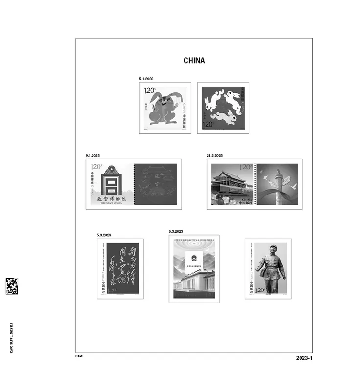 Davo Luxe supplement China 2023Bevat 12 bladen in luxe uitvoering (170 grs. stevig papier) met heldere klemstroken. Pag.nrs.: 2023-1 t/m 2023-9 en B1 t/m B3.