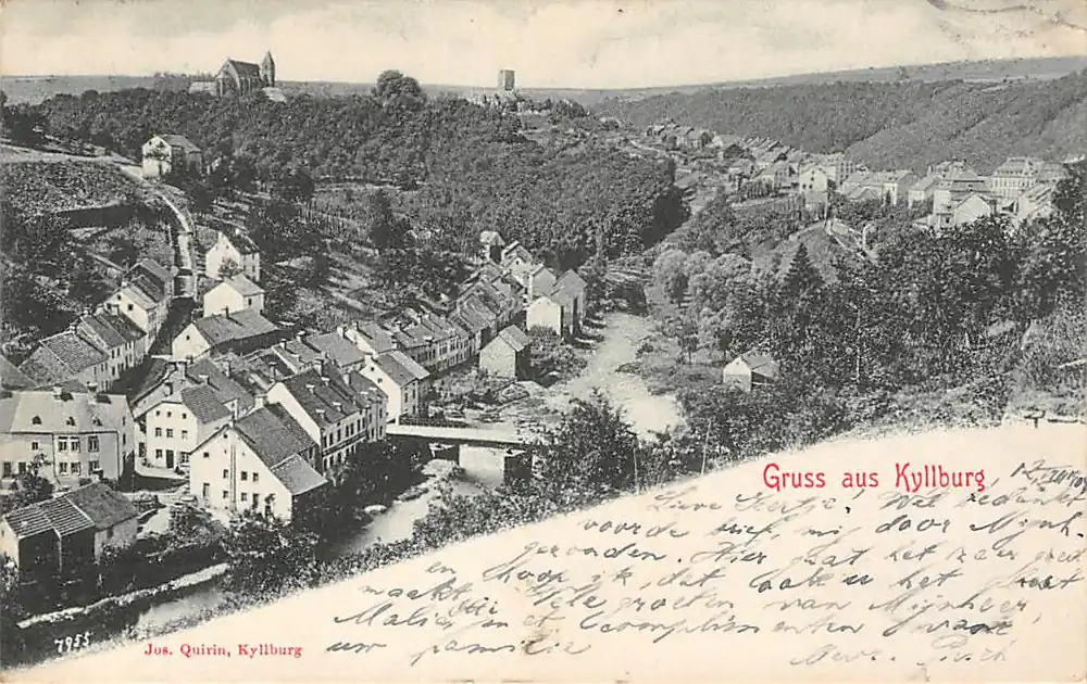 7955 Jos. Quirin, Kyllburg. Gelopen ansichtkaart met postzegel en stempels Coln Bahnpost 1904.