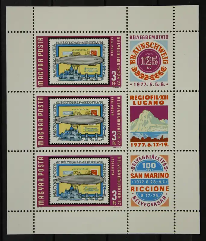 Hongarije 1977, Michel 3201, Postzegeltentoonstellingen in Braunschweig, Lugano en San Marino, getande Kleinbogen, postfris/MNH