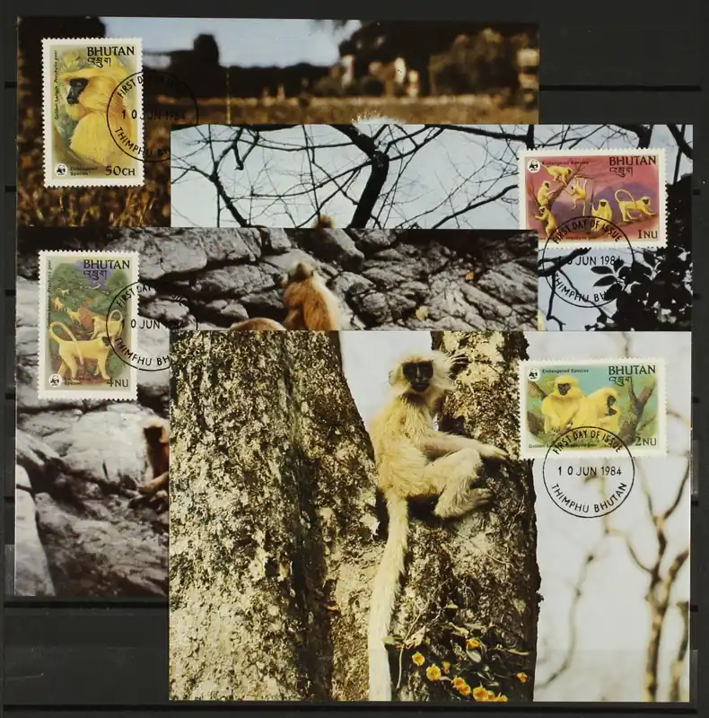 Bhutan 1984, Michel 840-843, Natuurbescherming (WNF): Apen, complete serie op Maximumkaarten