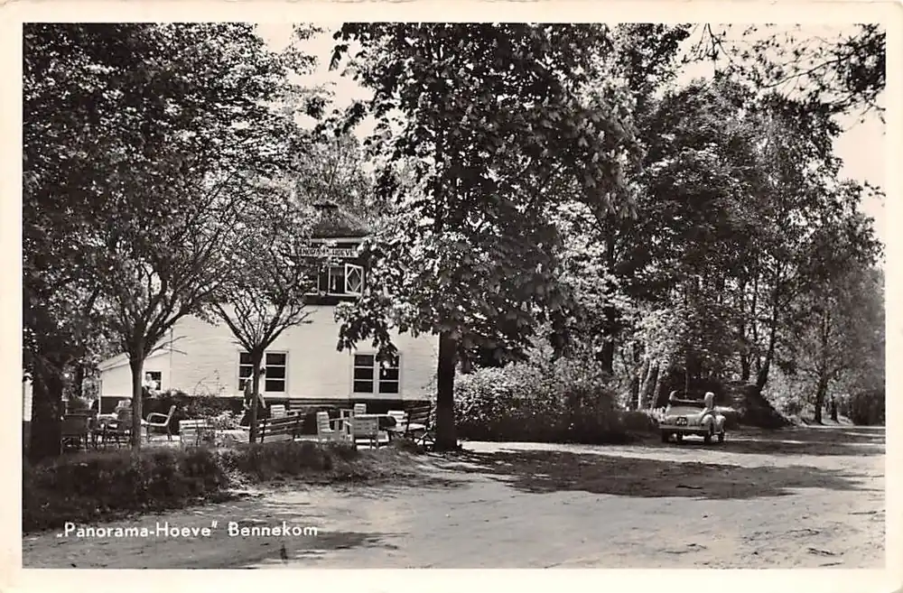Uitgave Theehuis Panorama Hoeve Bennekom. Gelopen ansichtkaart met postzegel en stempel Bennekom 1956.