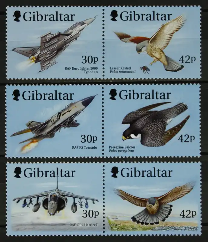 Gibraltar 1999, Michel 880-885, Roofvogels en vliegtuigen, complete postfrisse serie in 3 paren / MNH