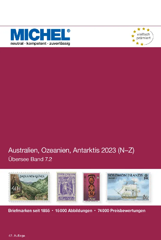 Michel catalogus Overzee deel 7.2: Australië, Oceanië/Antarctica 2023 (landen N-Z)42e editie, uitgave december 2022, 1134 pagina’s in kleur, meer dan 15.000 afbeeldingen en ca. 74.000 prijsnoteringen.Inhoud: Nauru, Nieuw Caledonië, Nieuw-Zeeland, Niuofo ‘ou eiland, Niue, Palau-eilanden, Papua Nw. Guinea, Penrhyn, Pitcairn, Rossgebied, Solomonseilanden, Samoa, Tokelau eilanden, Tonga, Tuvalu, Vanuatu, Wallis & Futuna.Australië en o.a. de Norfolkeilanden zijn opgenomen in deel 7.1 !