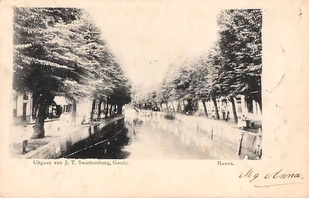 Uitgave van J.T. Swartsenburg, Gouda. Gelopen ansichtkaart met postzegel en drie stempels 1900. Uitgave van voor de eeuwwisseling.
